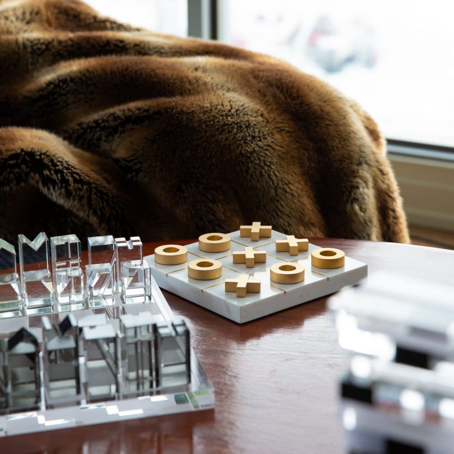 Polished European marble expertly inlaid with brass-plated metal turns a classic game into a striking desktop accent. With cast metal X and O pieces finished to match, our handcrafted set is handsome enough to keep on display, at the ready for a quick match anytime.